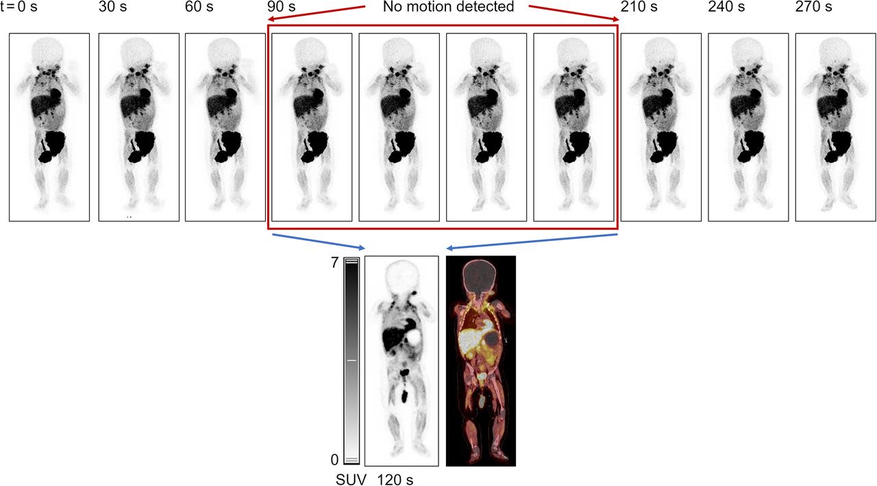 In paediatric imaging, the challenges of keeping the child calm and laying still is essential for achieving diagnostic image quality by reducing motion artefacts. This increased speed of image acquisition is therefore driving the ability to scan paediatric patients without any need for sedation (Figure 3) (8). Dose optimisation is of paramount concern in paediatric imaging due to the heightened sensitivity of developing tissues to ionising radiation and the potential long-term risks. Some initial studies with paediatric patients scanned with LAFOV PET-CT systems have demonstrated that it is possible to reduce injected dose to up to 1/10th of the usually recommended dosage allowing for 18F-FDG LAFOV PET-CT scanning with dose exposures below 1 mSv without significant degradation of image quality and diagnostic accuracy.