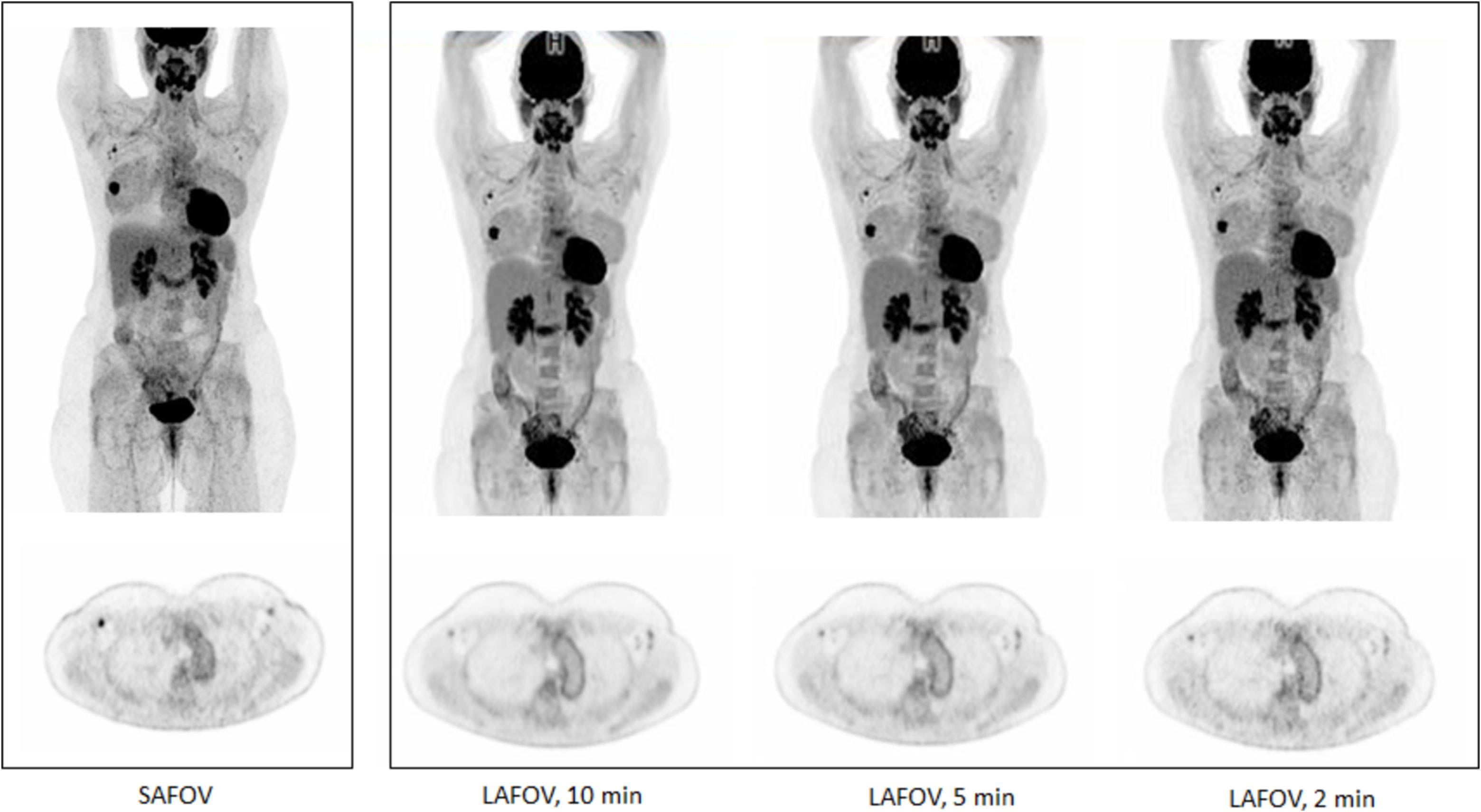 LAFOV PET-CT systems incorporate advanced detector technology and an extended axial FOV, up to a maximum currently of 194cm, which enables whole-body imaging without requiring patient repositioning. These systems also have substantially higher sensitivity which means the detectors measure a higher count rate of coincidence photons per unit activity inside the PET detector, thus allowing for lower radiotracer doses and reduced scan times. For example, a total-body scan that would take 20–30 minutes on a SAFOV PET-CT scanner can now be completed in under two minutes with LAFOV systems, reducing patient discomfort, movement artefacts, and improving throughput (Figure 2) (7)