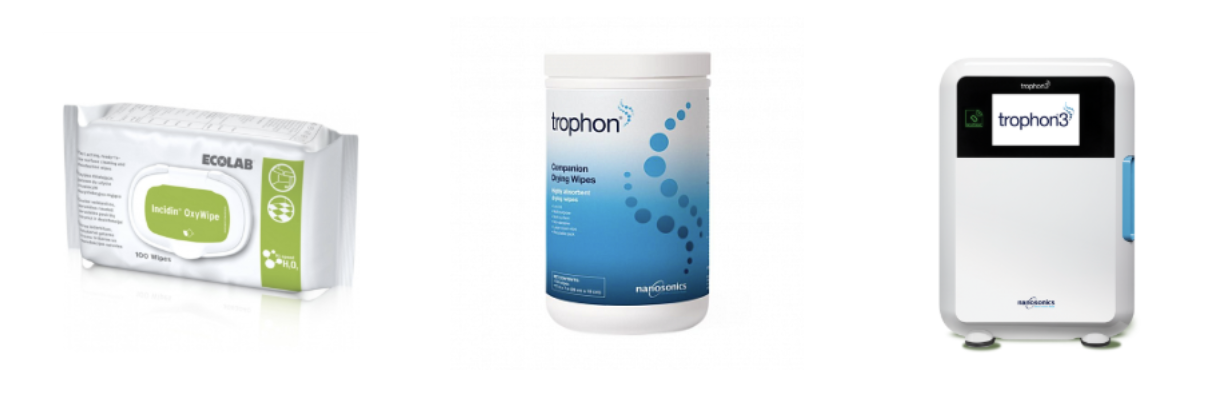 Following rigorous testing, Nanosonics recommends ECOLAB’s Incidin™ OxyWipe NG for pre-cleaning, drying with a Nanosonics Companion Drying wipe, and subsequent automated high-level disinfection using the trophon device.
