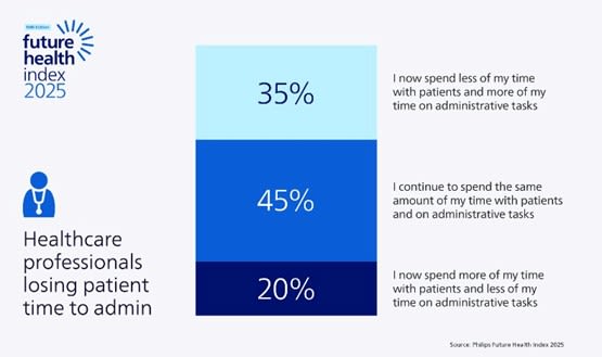 Every day, healthcare professionals go above and beyond for their patients, yet many find their time and energy drained by an ever-growing burden of administrative work. The Philips Future Health Index 2025 report shows that more than one-third of healthcare professionals now spend less time with patients and more on paperwork compared to five years ago, while only 20 per cent get to spend more time with patients. This shift is taking a heavy toll on their well-being: healthcare professionals who spend less time with patients than they did five years ago feel significantly more stressed compared with their peers.