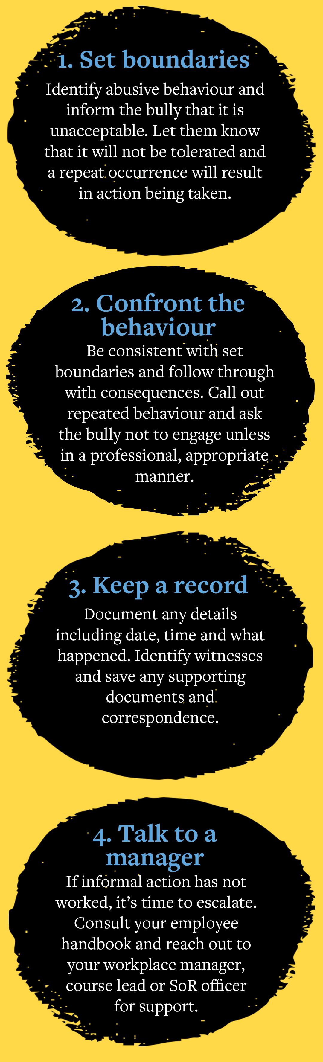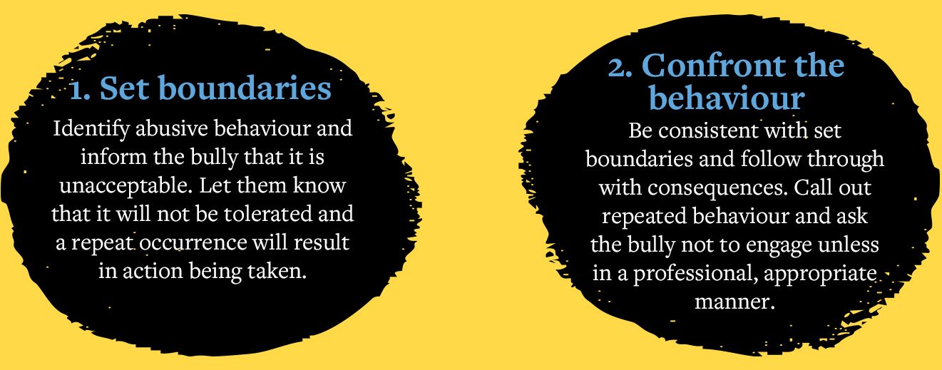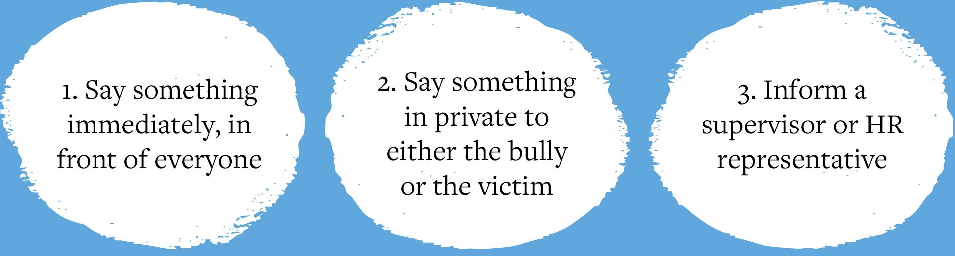 Empowering the bystander is one of the most effective ways to halt workplace bullying. A bystander witnessing unacceptable behaviour can do one of three things, bearing in mind the likely preference of the individual who is the target of the abuse.
