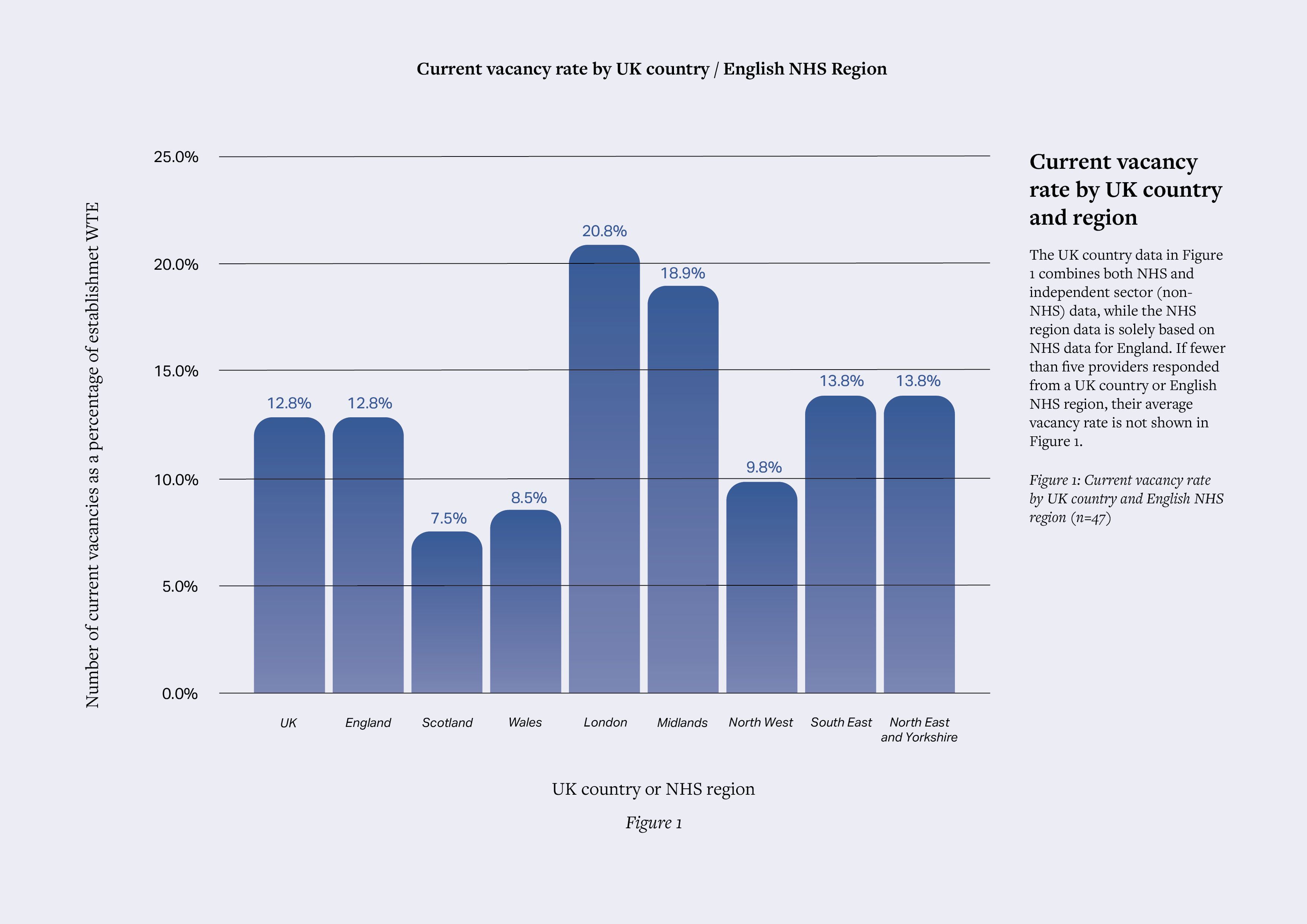 We found that 89 per cent of respondents reported vacant diagnostic radiography workforce posts in their department. Current UK vacancy rate across respondents was at 12.8 per cent. By country, that's 12.8 per cent in England, 7.5 per cent in Scotland, 8.3 per cent in Wales.