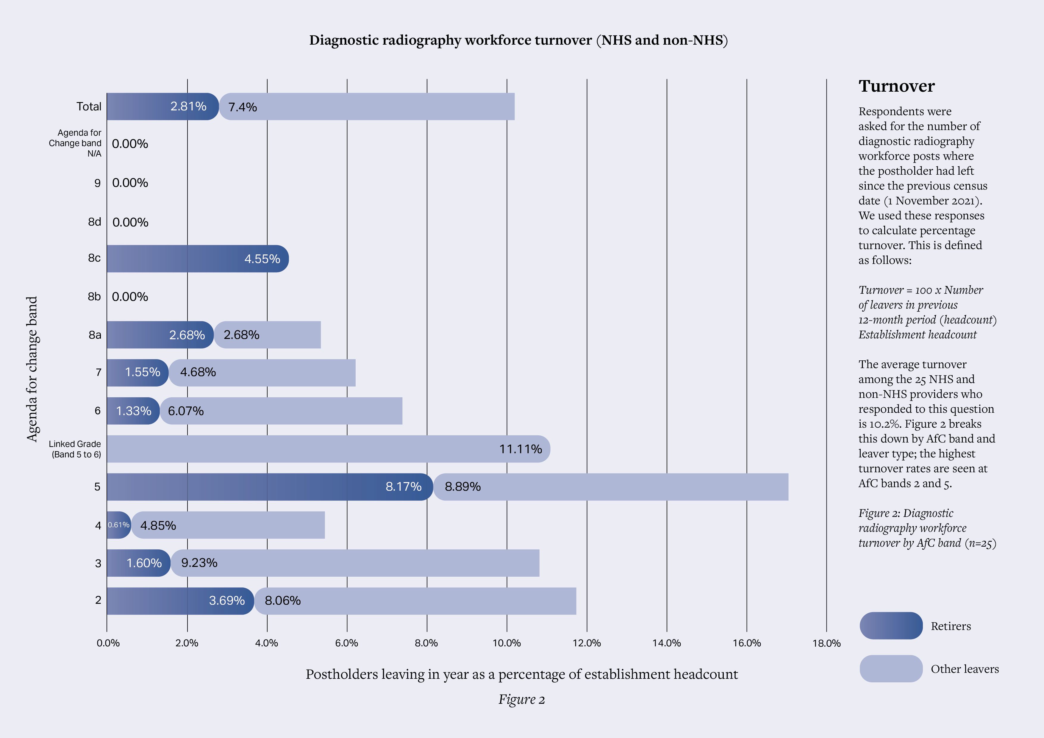 We also look at turnover, which stood at an average of 10.21 per cent over the past year, and international recruitment, which constituted 8.1 per cent of headcount, and is one of the hot topics this year. Apprenticeships are growing in England , which is really great to see, because I think that will be one of the solutions to the workforce crisis radiography is experiencing. It's been woefully inadequate for years, and still needs support for those posts.