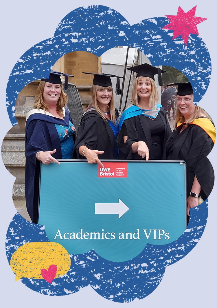 Donna (second from left) on UWE graduation day, with colleagues Laura Edmonds, Naomi Harrison and Sarah Dixon