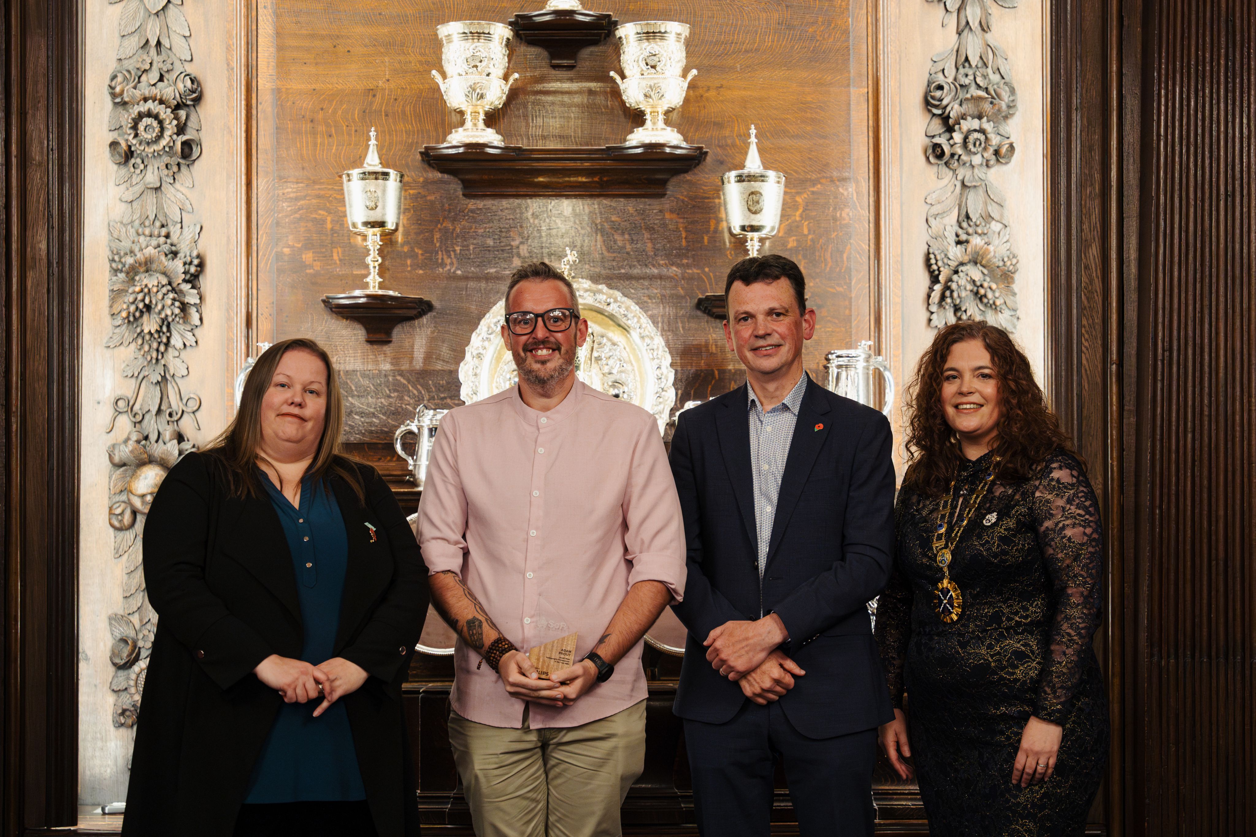 (L-R) Sally Edgington, CEO of AXREM, Rob Emery, regional director at Philips, senior radiographer Adam Prout and Katie Thompson, president of the SoR, presenting Adam with an award for South West Radiography Professional of the Year