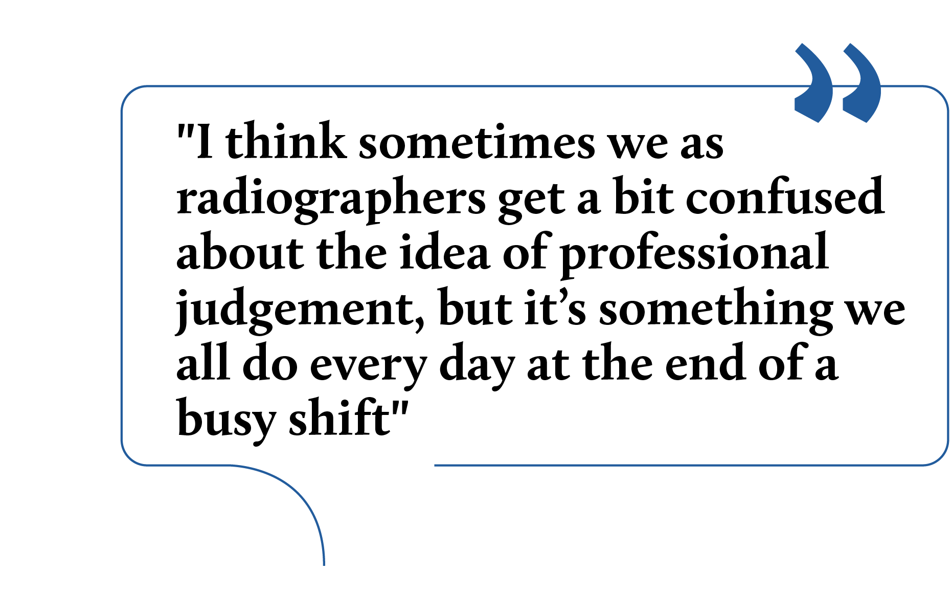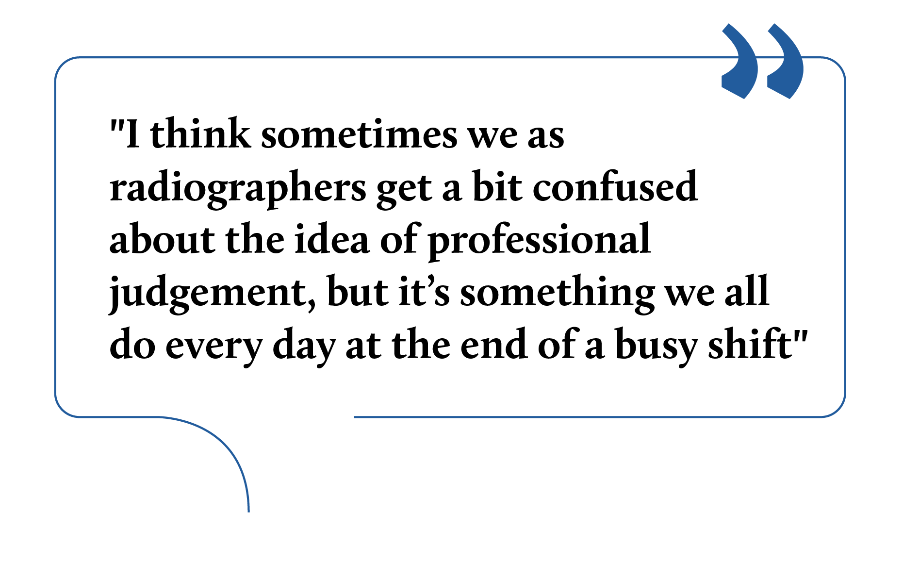 On the field as a radiographer, Claire says professional judgement is often part of everyday conversation – whether their fellow radiographers realise it or not. “I think sometimes we as radiographers get a bit confused about the idea of professional judgement, but it’s something that we all do every day at the end of a busy shift,” she explains.