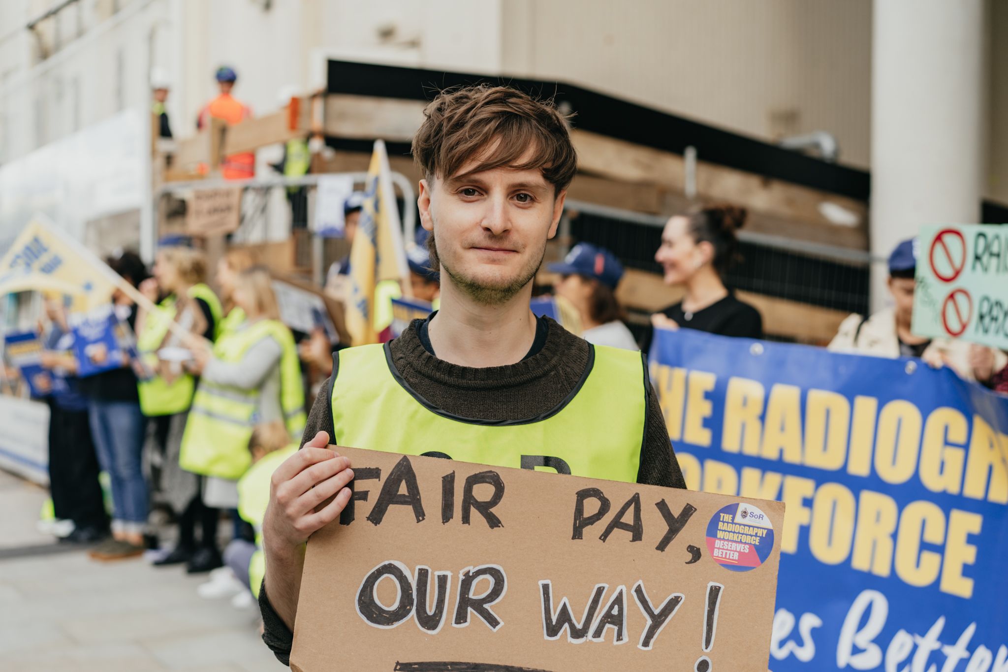 Diagnostic radiographer Matt Johnson gripped a home-made placard that demanded “Fair Pay Our Way!” The radiography profession had been “brushed under the carpet” said Matt. “We have a specific role that only we can do, and we are a profession that deserves a proper pay rise like the others.”