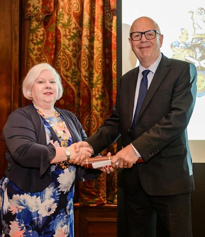 Steve Milner receiving a Fellowship for the College of Radiographers from 2018-19 SoR president Sue Webb