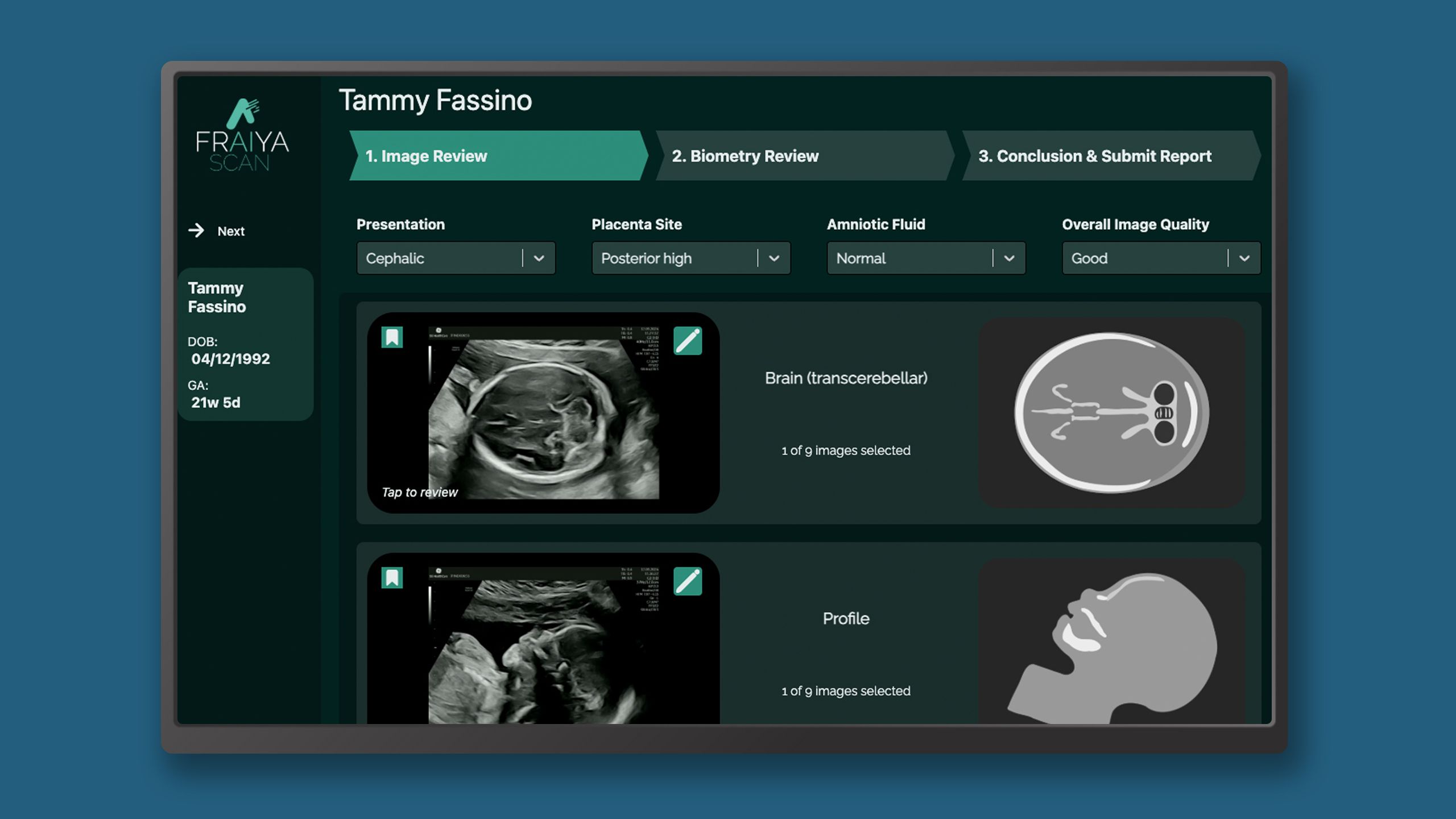 Fraiya’s suite of AI-enabled tools seeks to reduce examination times, improve screening and diagnosis, and work seamlessly across scanning machines. A tablet accessory connected to the ultrasound machine, using software called FraiyaScan, enables sonographers to receive real-time AI assistance for mid-trimester anomaly scans. Every scan can then be streamed asynchronously to remote expert reviewers, who can perform an AI-assisted peer review of each examination using their internal tool, FraiyaDetect.