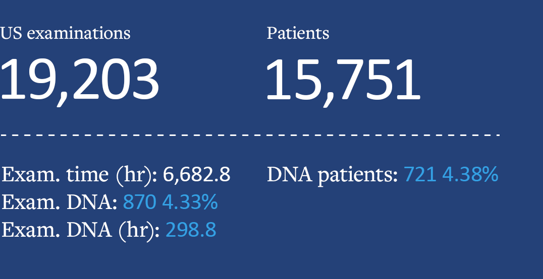 Examination data comes from the Radiology Information System (RIS). Patients sometimes have multiple examinations performed in one attendance. New data now captures time weighted examinations (or number of hours performing scans) and DNA rates per exam and board.
