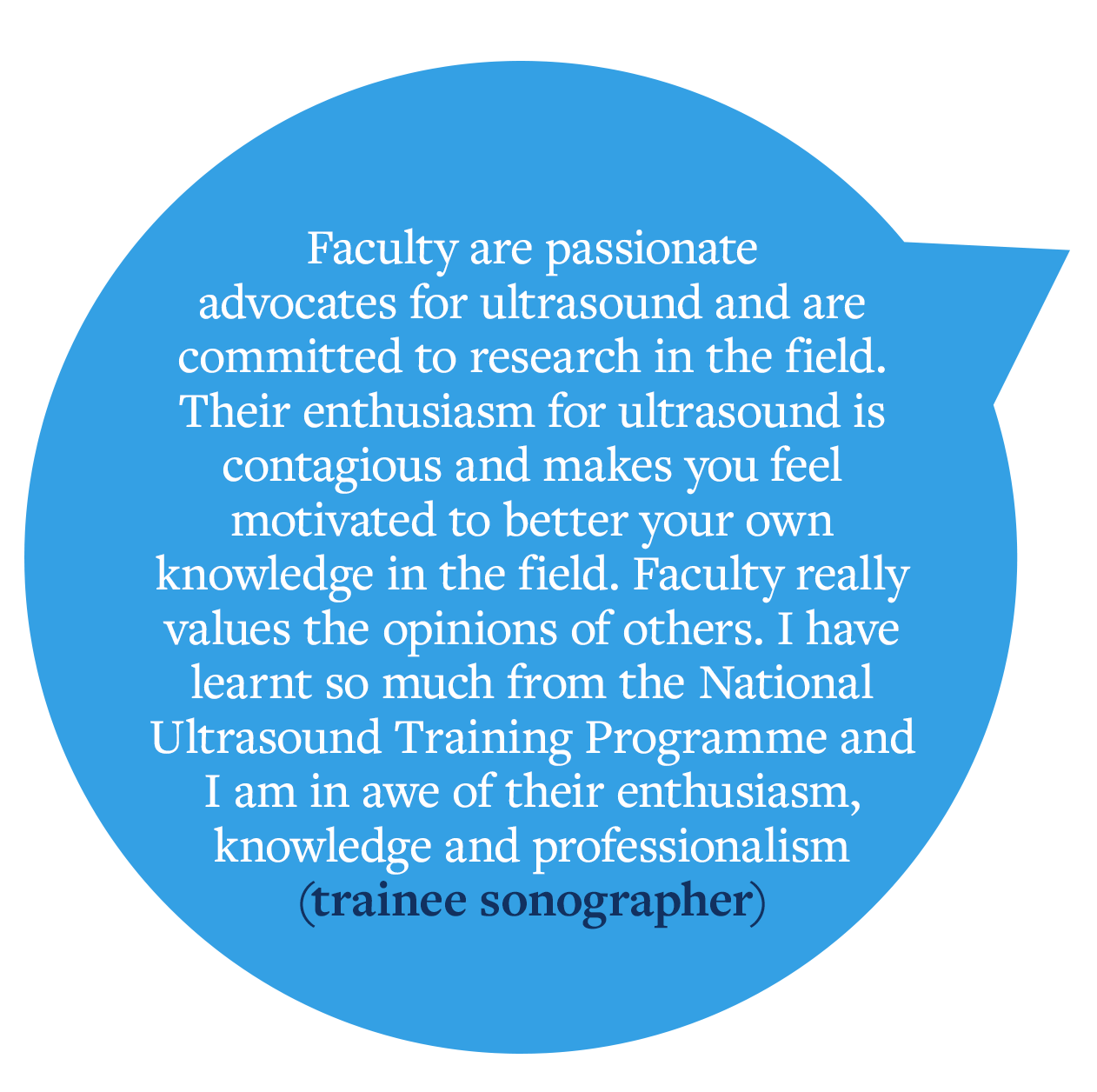 We believe learning sonography requires a holistic approach from discussing clinical presentation, communication with the patient, caring for the patient, scanning, clinical decision making and reporting. We aim for our learners to leave feeling clinically competent, confident and engaged in optimal patient care and reporting.