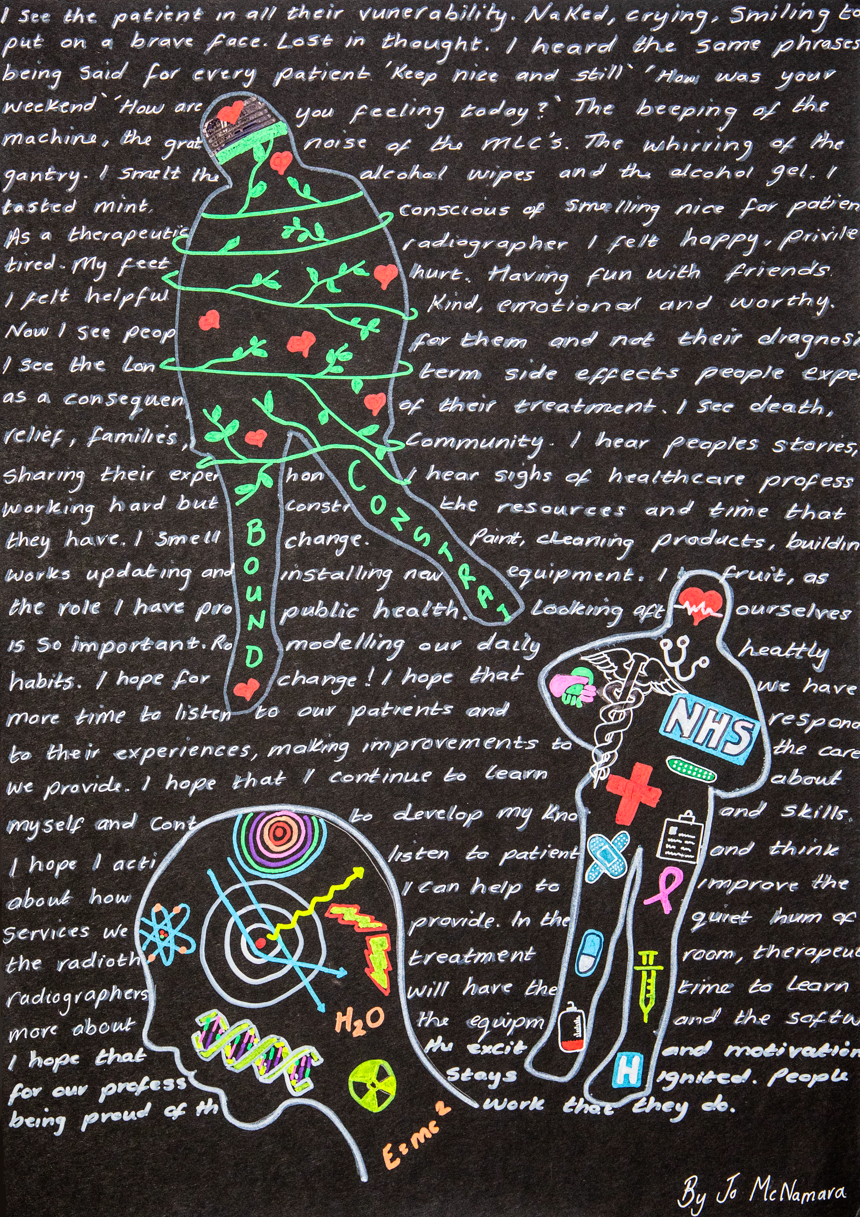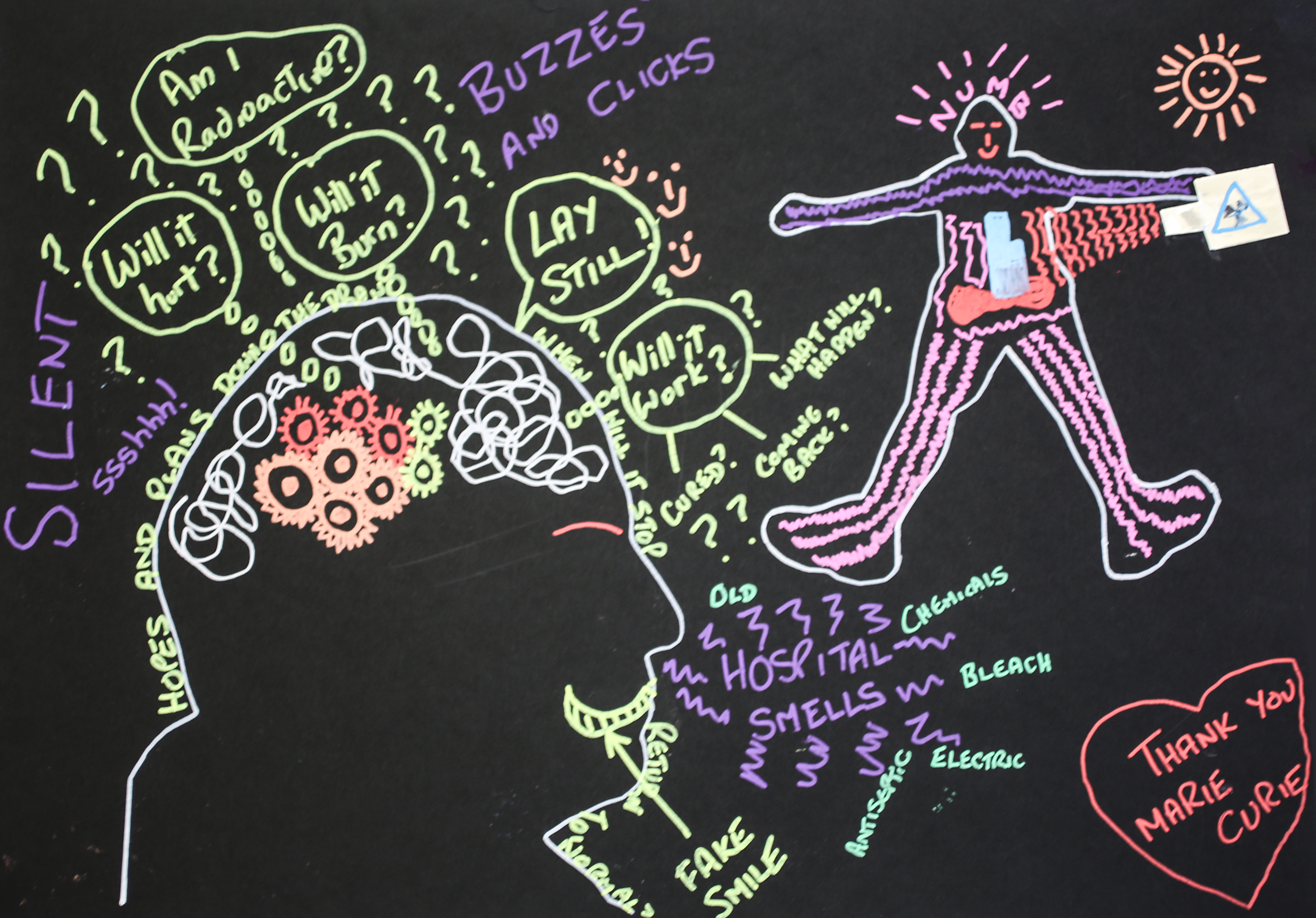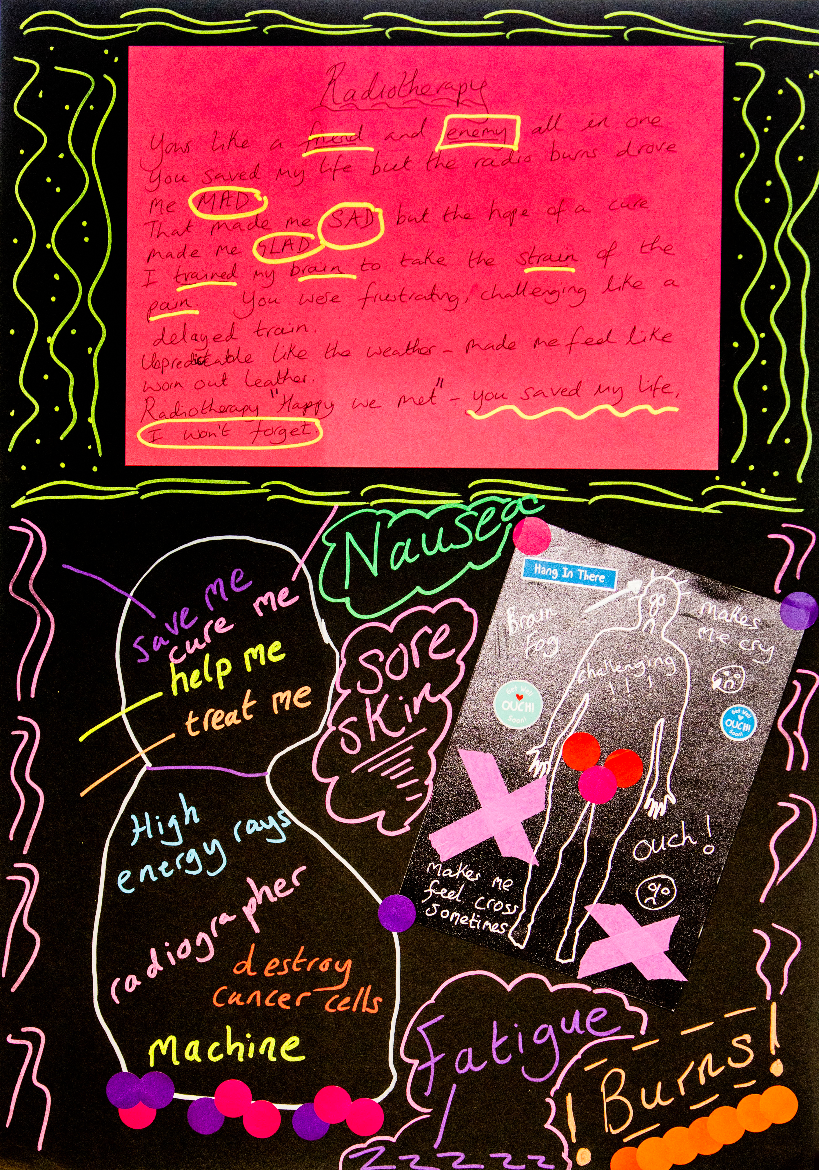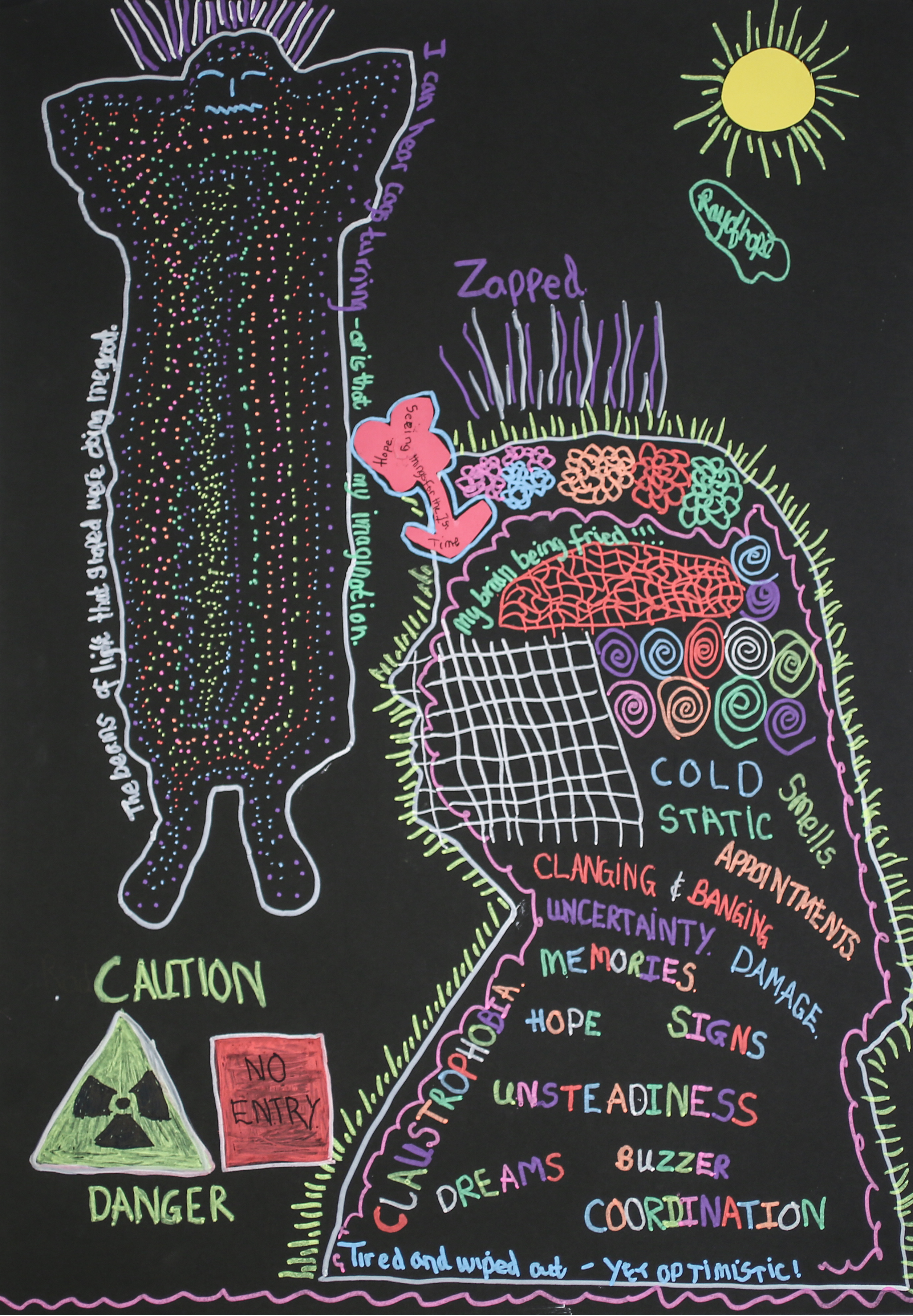 Gemma’s warmth and enthusiasm sparked the development of a collaborative art project, bringing together people who have had radiotherapy, their family members or carers, radiation researchers and Therapeutic Radiographers to create works of art about their experience of radiotherapy. The project asks: ‘What does radiotherapy mean to you?’