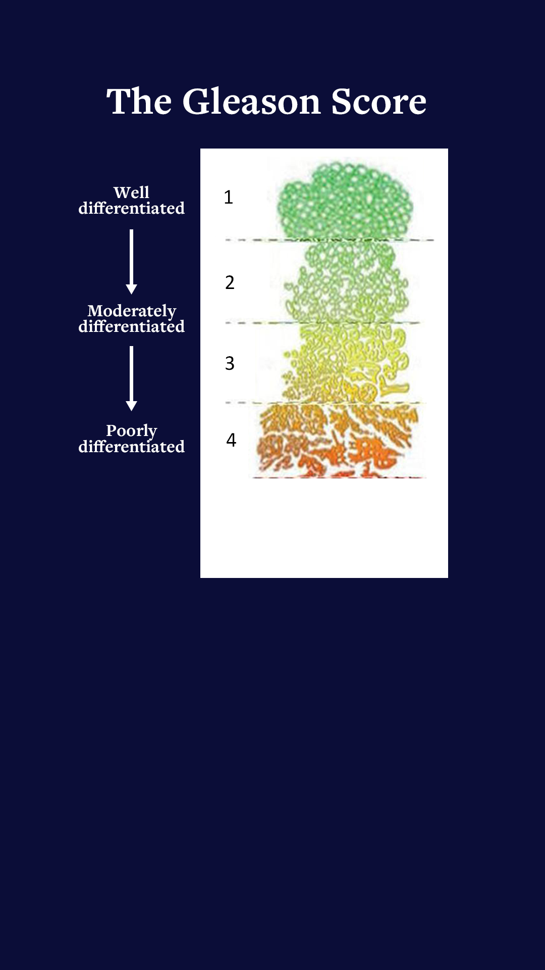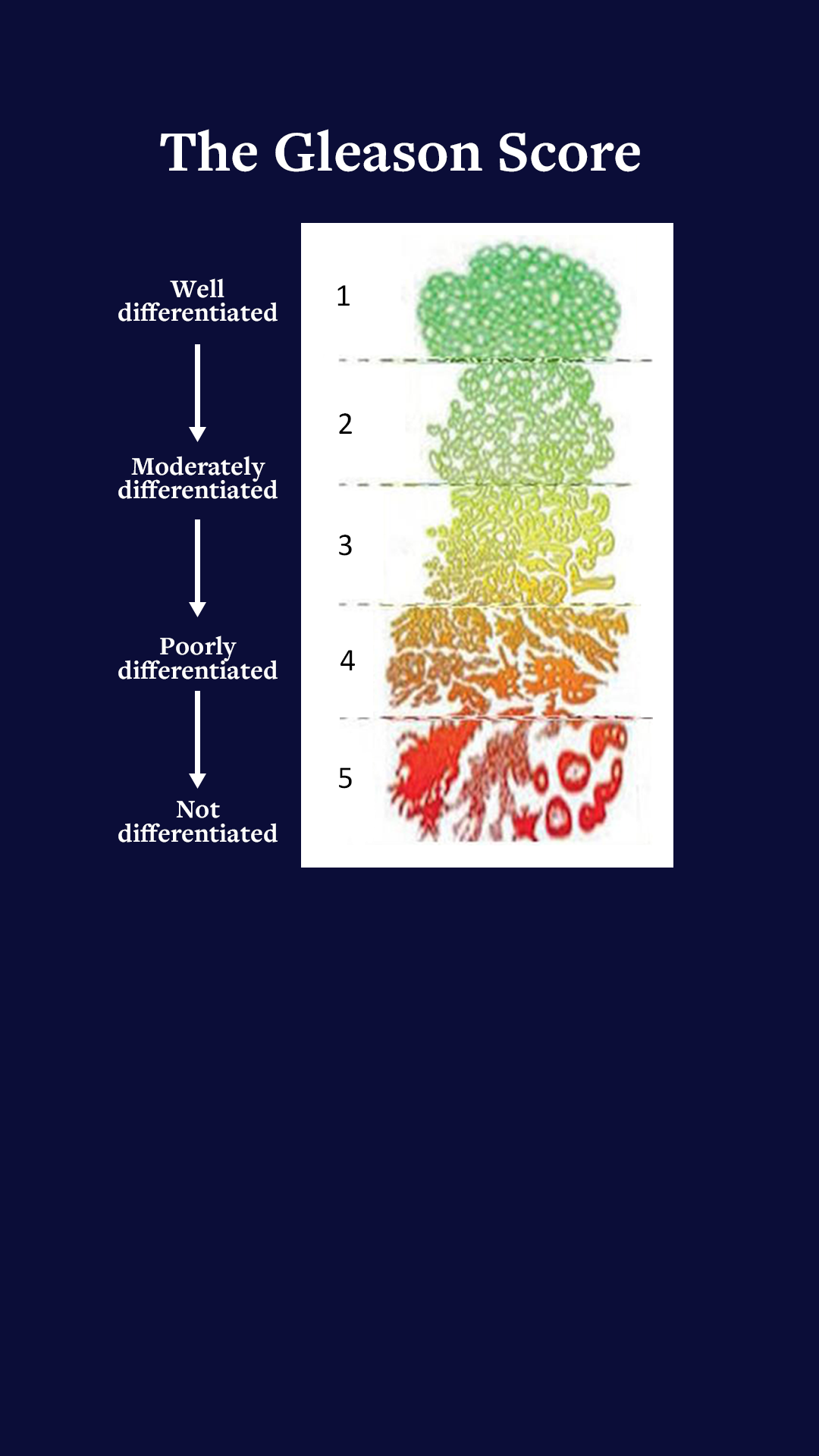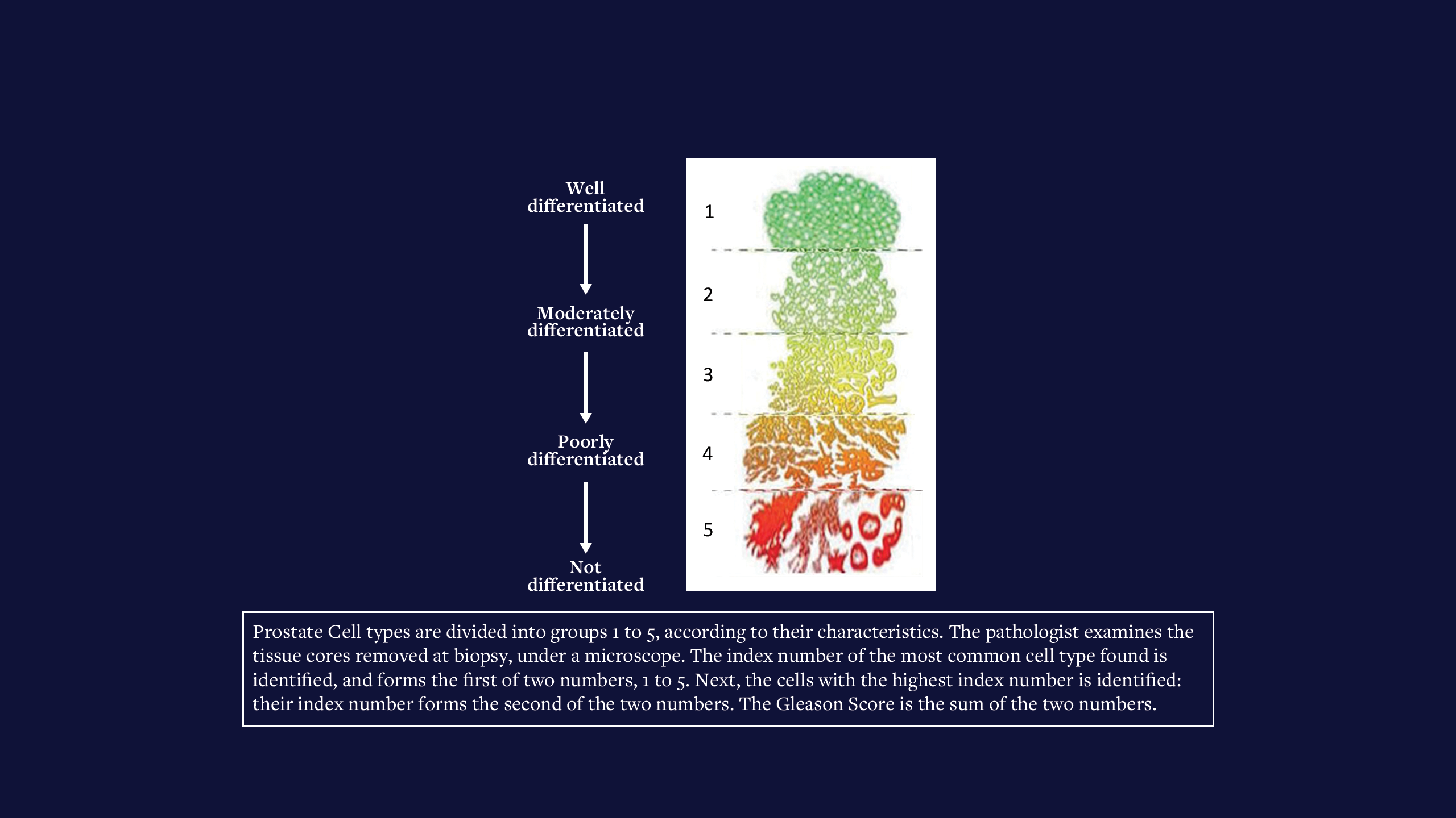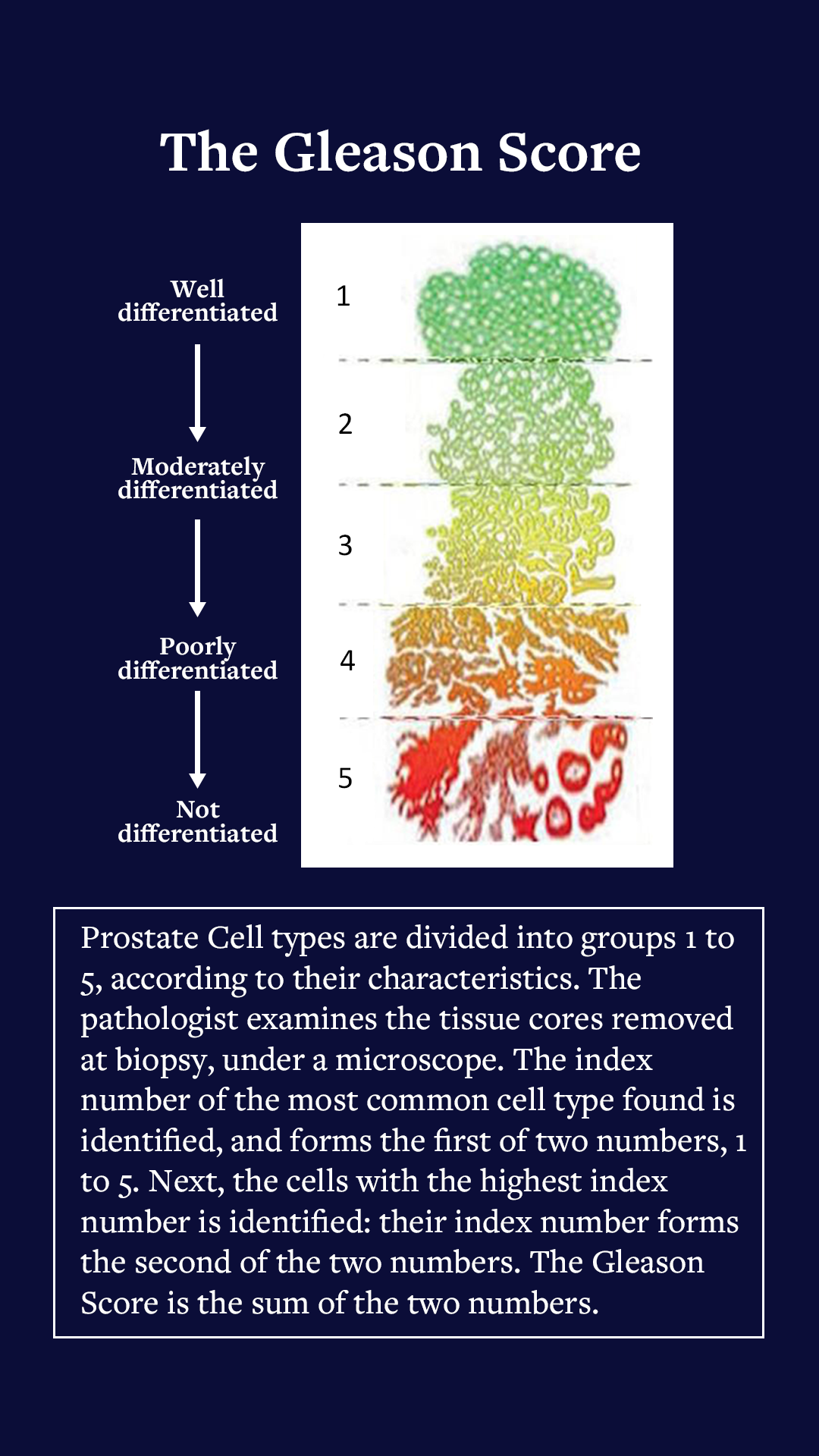 The Gleason Score’s five groups express the degree of disease using outcomes from the pathology testing : Group 1 (normal) to Group 5 (extensive malignancy). The group number of the most common cell type is added to the group number of the most malignant cell type found, to give the Gleason Score. Mine was 3+4=7. Definitely significant but not the worst case.